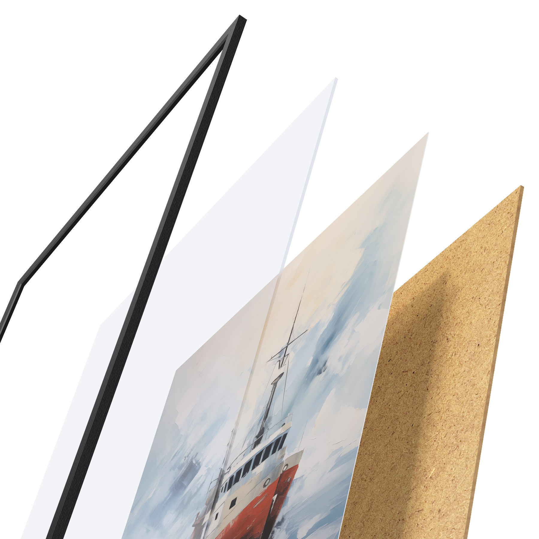 De poster bestaat uit een frame, plexiglas, geprinte afbeelding en spaanplaat achterkant. De poster kan meteen aan de muur worden gehangen dankzij de bevestigingen op de achterkant.