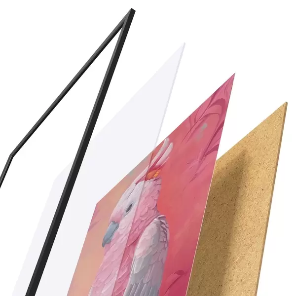 De poster bestaat uit een frame, plexiglas, geprinte afbeelding en spaanplaat achterkant. De poster kan meteen aan de muur worden gehangen dankzij de bevestigingen op de achterkant.