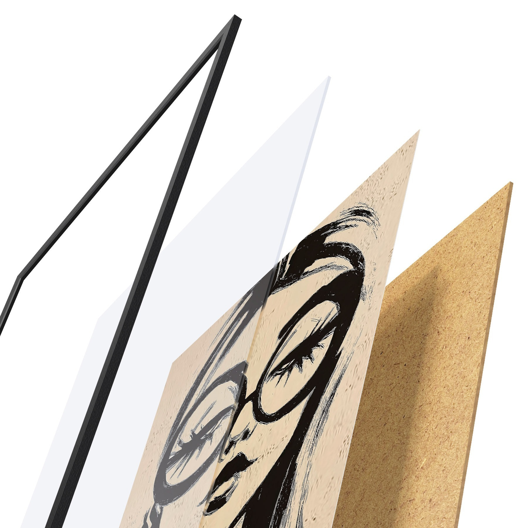 De poster bestaat uit een frame, plexiglas, geprinte afbeelding en spaanplaat achterkant. De poster kan meteen aan de muur worden gehangen dankzij de bevestigingen op de achterkant.