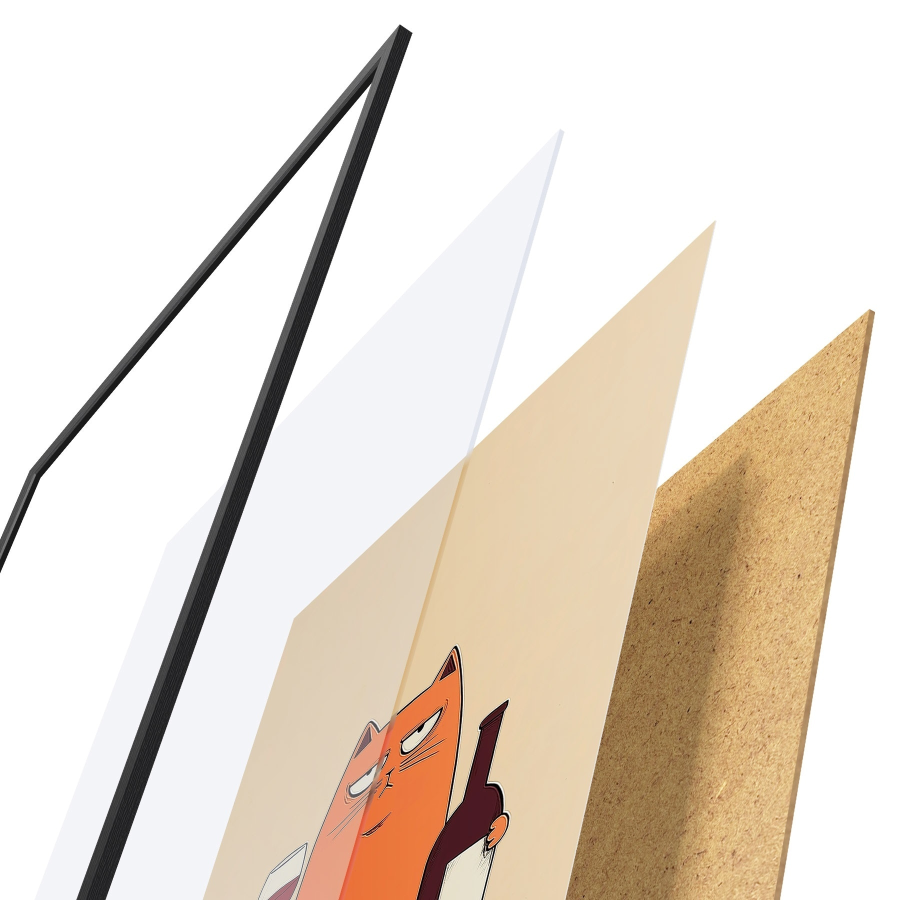 De poster bestaat uit een frame, plexiglas, geprinte afbeelding en spaanplaat achterkant. De poster kan meteen aan de muur worden gehangen dankzij de bevestigingen op de achterkant.