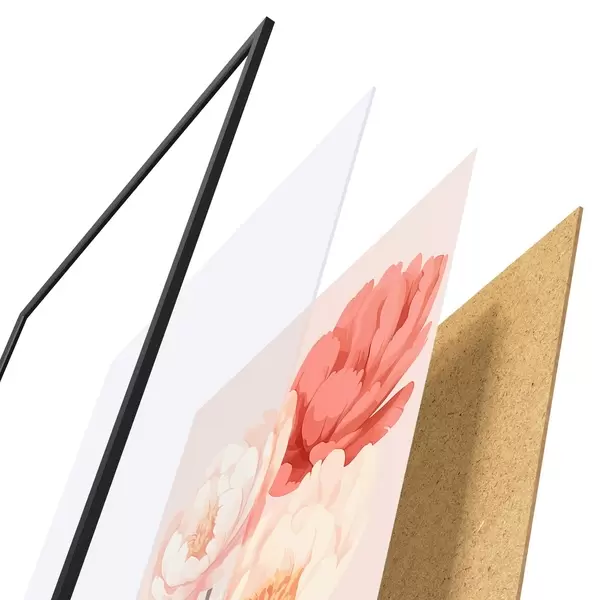 De poster bestaat uit een frame, plexiglas, geprinte afbeelding en spaanplaat achterkant. De poster kan meteen aan de muur worden gehangen dankzij de bevestigingen op de achterkant.