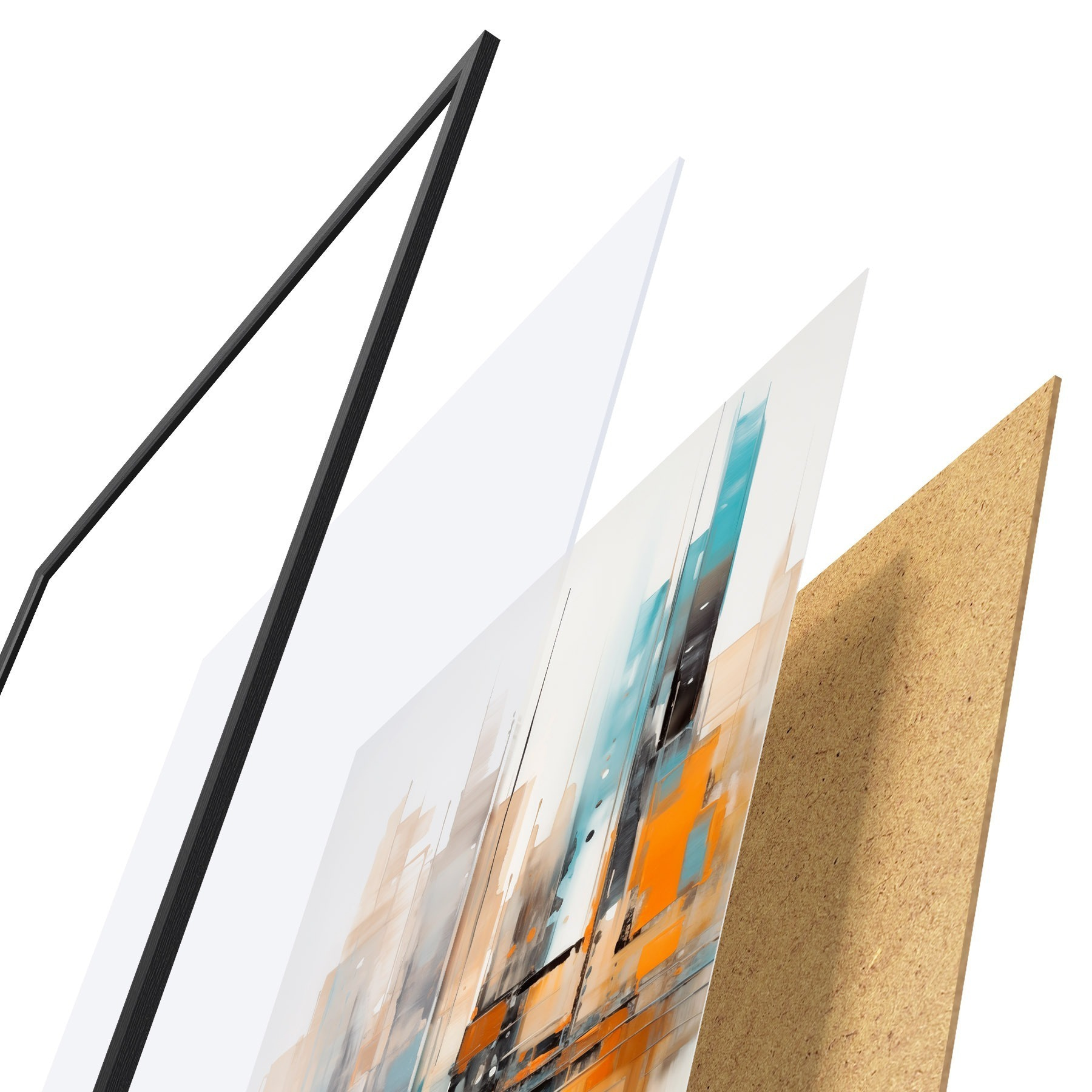 De poster bestaat uit een frame, plexiglas, geprinte afbeelding en spaanplaat achterkant. De poster kan meteen aan de muur worden gehangen dankzij de bevestigingen op de achterkant.