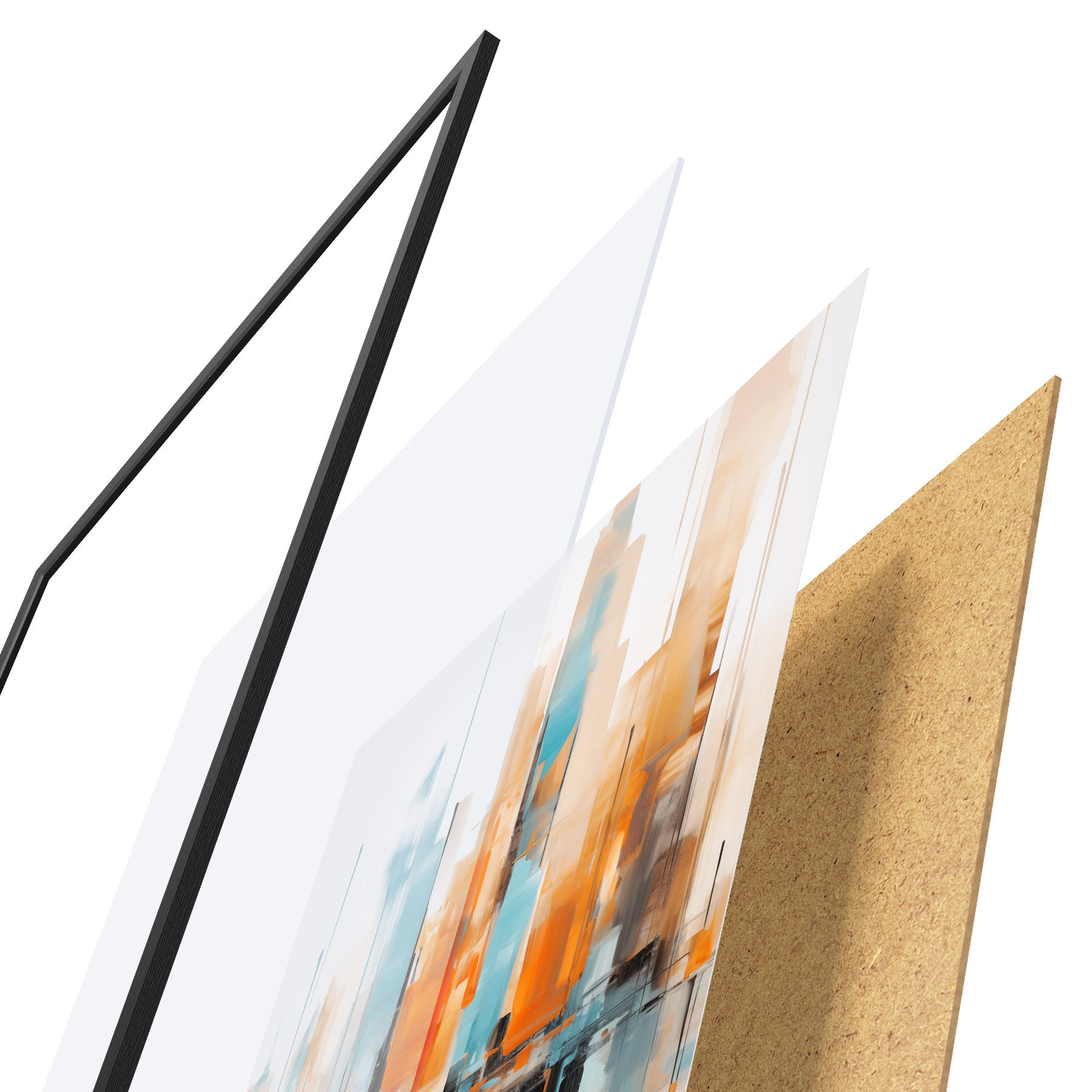 De poster bestaat uit een frame, plexiglas, geprinte afbeelding en spaanplaat achterkant. De poster kan meteen aan de muur worden gehangen dankzij de bevestigingen op de achterkant.