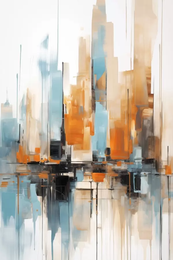 Poster Abstract stadsgezicht met verticale penseelstreken in tinten oranje, blauw en wit, schilderstijl Nr f46267