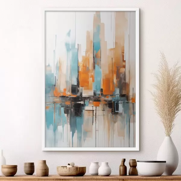Poster Abstract stadsgezicht met verticale penseelstreken in tinten oranje, blauw en wit, schilderstijl Nr f46267
