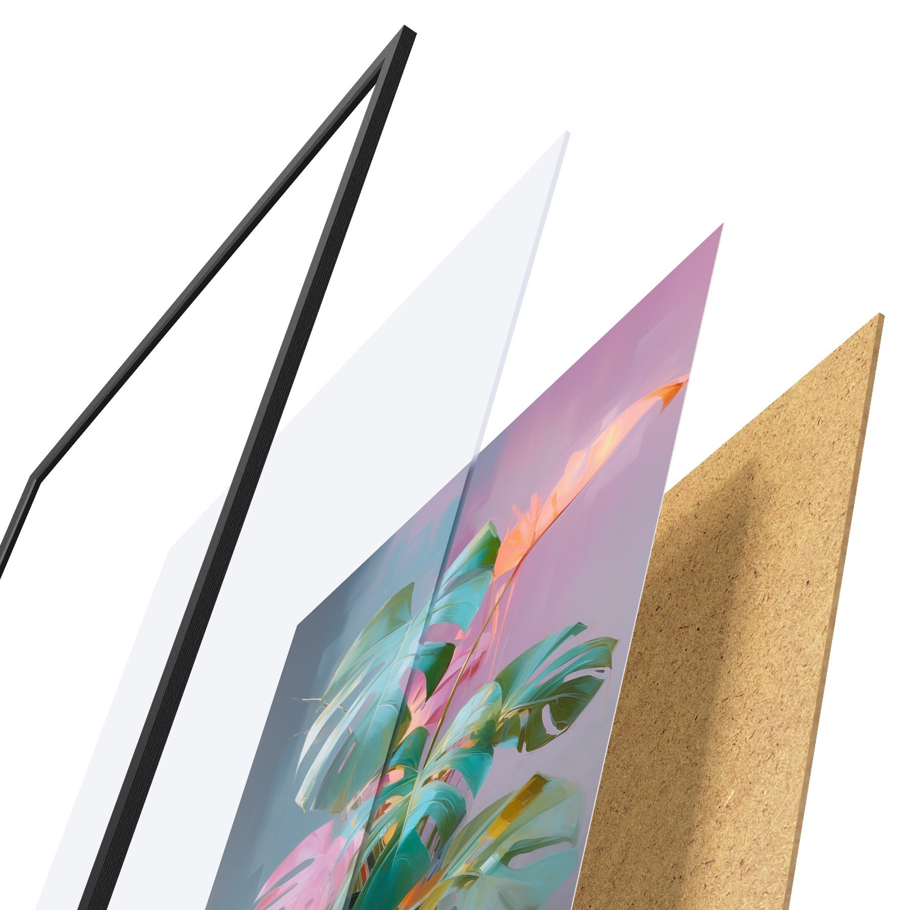 De poster bestaat uit een frame, plexiglas, geprinte afbeelding en spaanplaat achterkant. De poster kan meteen aan de muur worden gehangen dankzij de bevestigingen op de achterkant.