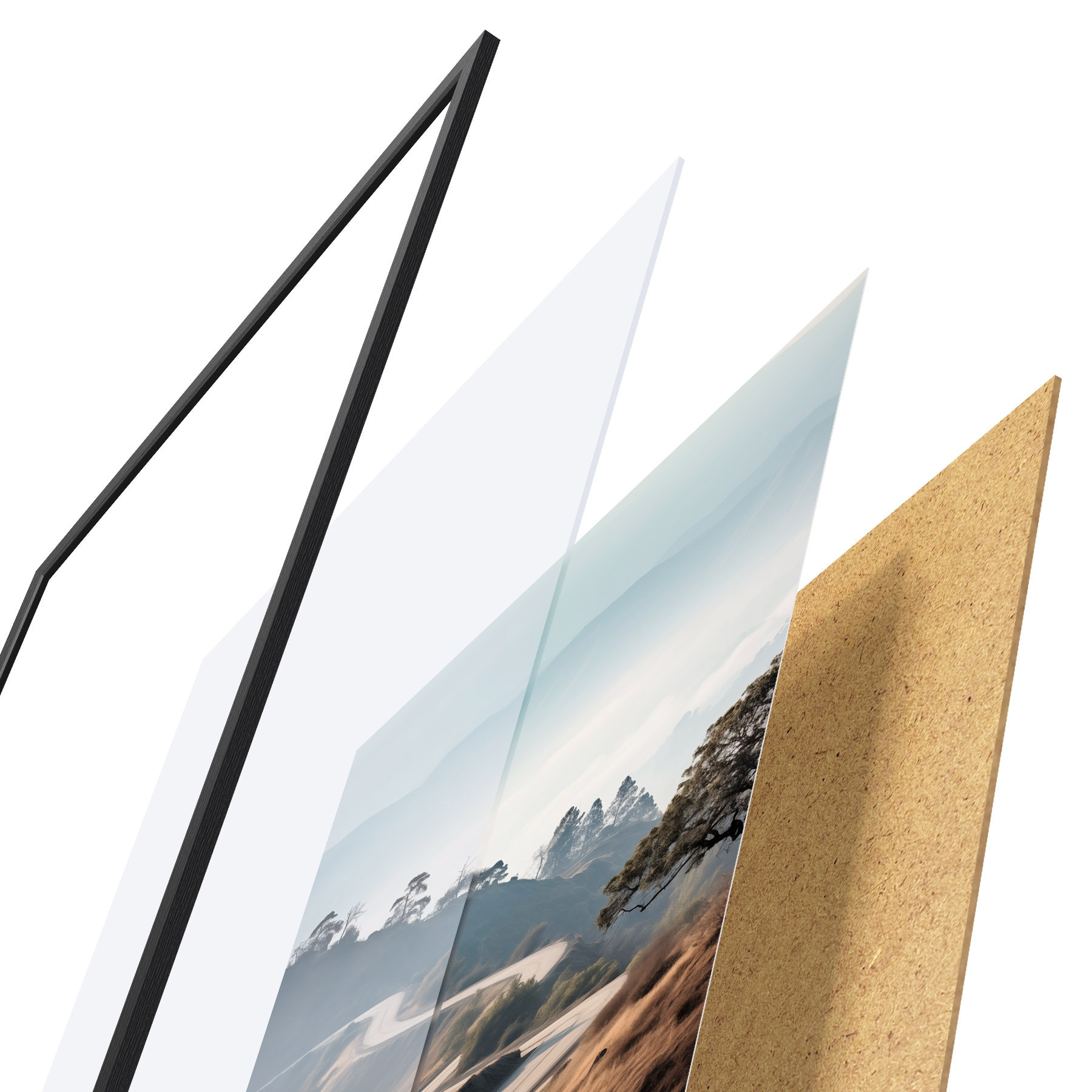De poster bestaat uit een frame, plexiglas, geprinte afbeelding en spaanplaat achterkant. De poster kan meteen aan de muur worden gehangen dankzij de bevestigingen op de achterkant.