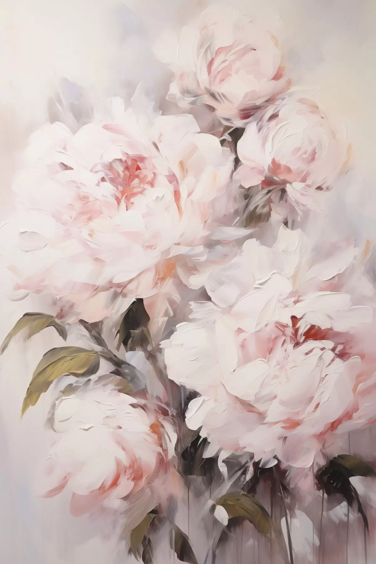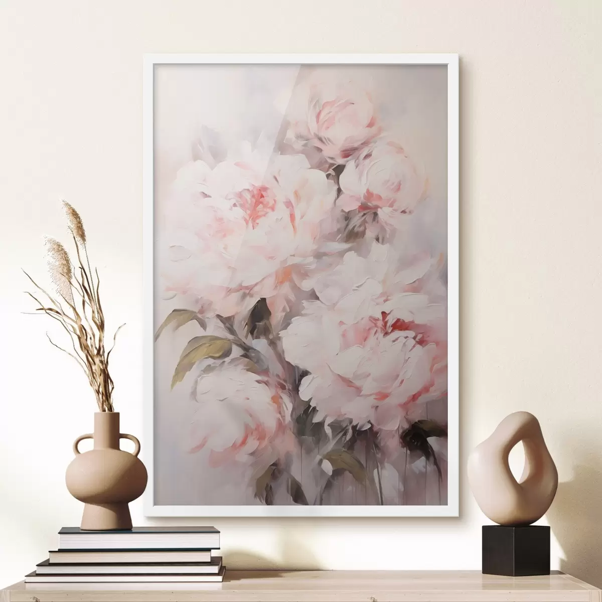 Poster Een boeket lichtroze pioenrozen met groene bladeren, zachte penseelstreken, pastelkleuren, op een lichte achtergrond Nr f46294