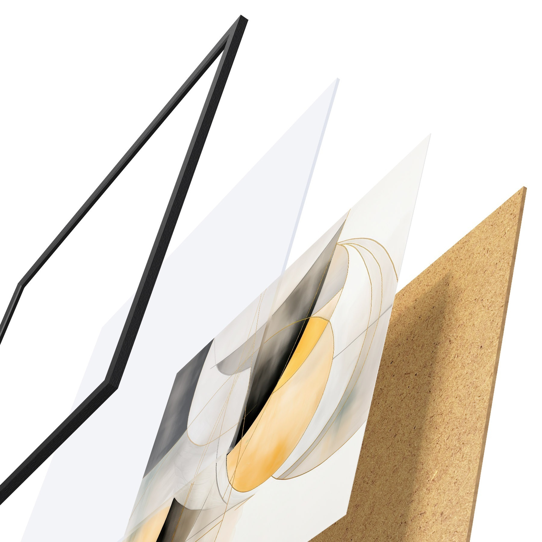 De poster bestaat uit een frame, plexiglas, geprinte afbeelding en spaanplaat achterkant. De poster kan meteen aan de muur worden gehangen dankzij de bevestigingen op de achterkant.