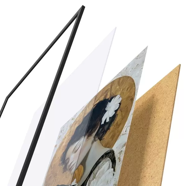 De poster bestaat uit een frame, plexiglas, geprinte afbeelding en spaanplaat achterkant. De poster kan meteen aan de muur worden gehangen dankzij de bevestigingen op de achterkant.