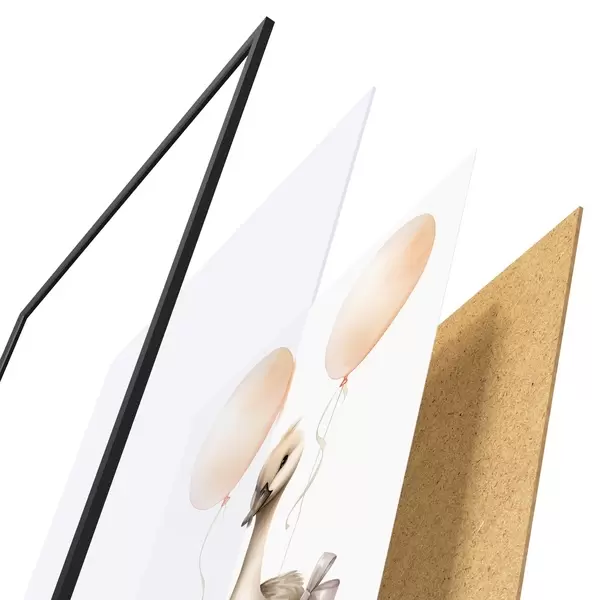 De poster bestaat uit een frame, plexiglas, geprinte afbeelding en spaanplaat achterkant. De poster kan meteen aan de muur worden gehangen dankzij de bevestigingen op de achterkant.