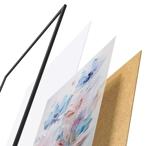 De poster bestaat uit een frame, plexiglas, geprinte afbeelding en spaanplaat achterkant. De poster kan meteen aan de muur worden gehangen dankzij de bevestigingen op de achterkant.