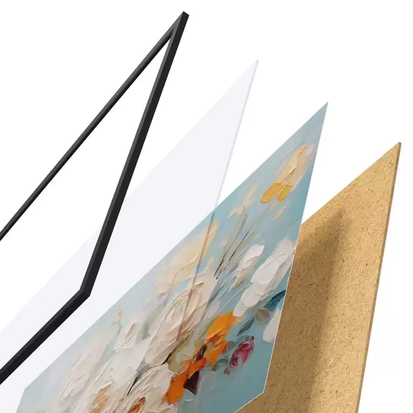 De poster bestaat uit een frame, plexiglas, geprinte afbeelding en spaanplaat achterkant. De poster kan meteen aan de muur worden gehangen dankzij de bevestigingen op de achterkant.