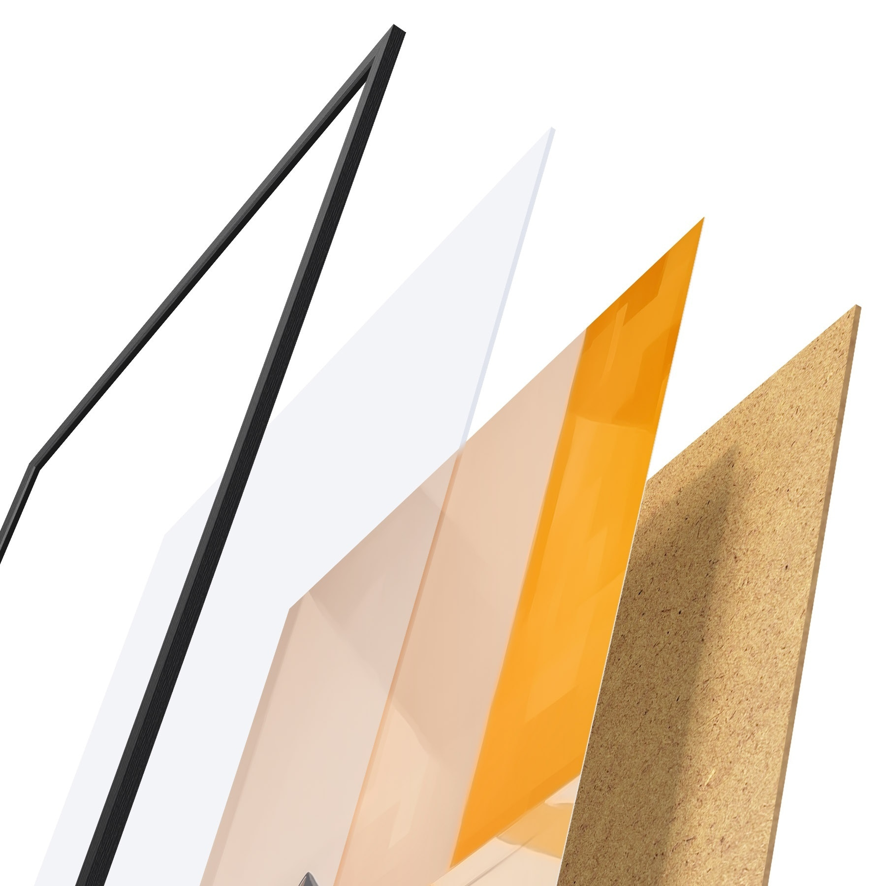 De poster bestaat uit een frame, plexiglas, geprinte afbeelding en spaanplaat achterkant. De poster kan meteen aan de muur worden gehangen dankzij de bevestigingen op de achterkant.