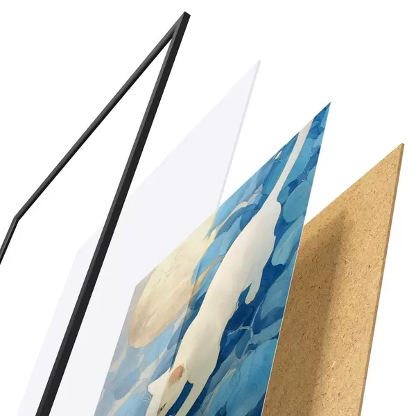 De poster bestaat uit een frame, plexiglas, geprinte afbeelding en spaanplaat achterkant. De poster kan meteen aan de muur worden gehangen dankzij de bevestigingen op de achterkant.
