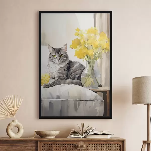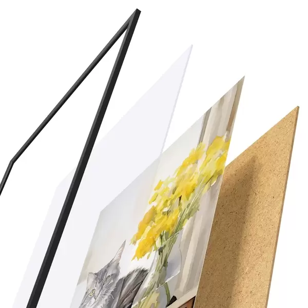 De poster bestaat uit een frame, plexiglas, geprinte afbeelding en spaanplaat achterkant. De poster kan meteen aan de muur worden gehangen dankzij de bevestigingen op de achterkant.