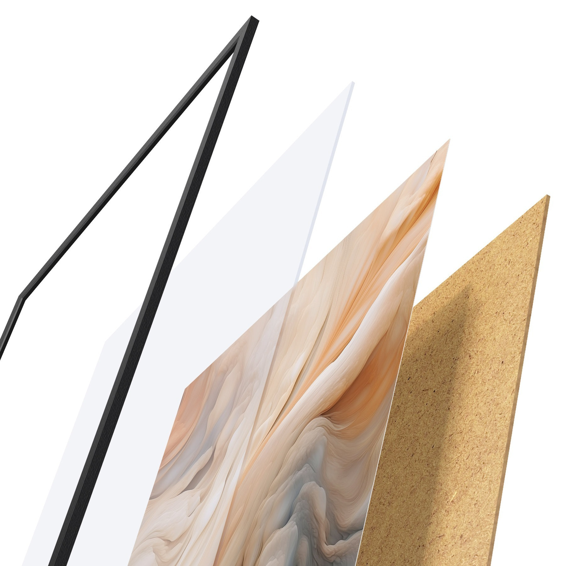 De poster bestaat uit een frame, plexiglas, geprinte afbeelding en spaanplaat achterkant. De poster kan meteen aan de muur worden gehangen dankzij de bevestigingen op de achterkant.