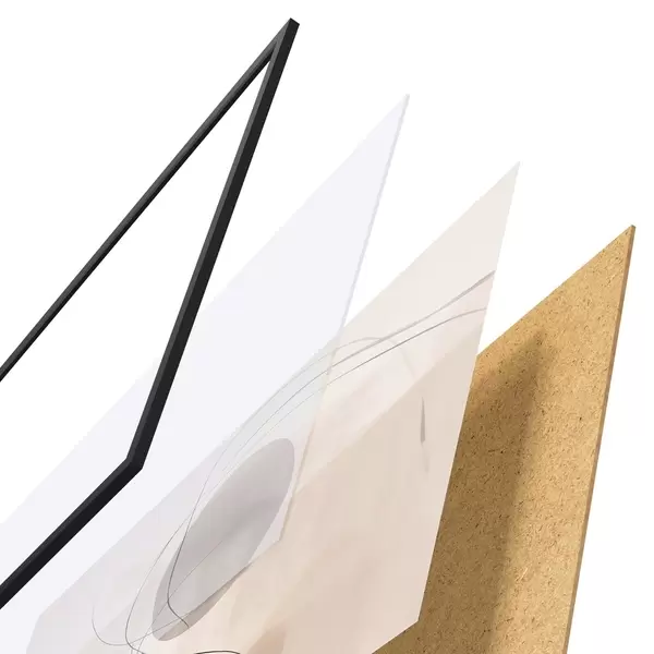 De poster bestaat uit een frame, plexiglas, geprinte afbeelding en spaanplaat achterkant. De poster kan meteen aan de muur worden gehangen dankzij de bevestigingen op de achterkant.