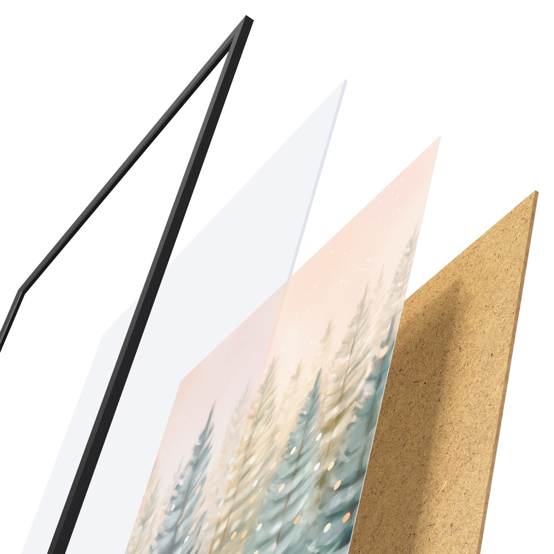 De poster bestaat uit een frame, plexiglas, geprinte afbeelding en spaanplaat achterkant. De poster kan meteen aan de muur worden gehangen dankzij de bevestigingen op de achterkant.
