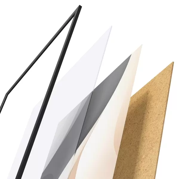 De poster bestaat uit een frame, plexiglas, geprinte afbeelding en spaanplaat achterkant. De poster kan meteen aan de muur worden gehangen dankzij de bevestigingen op de achterkant.