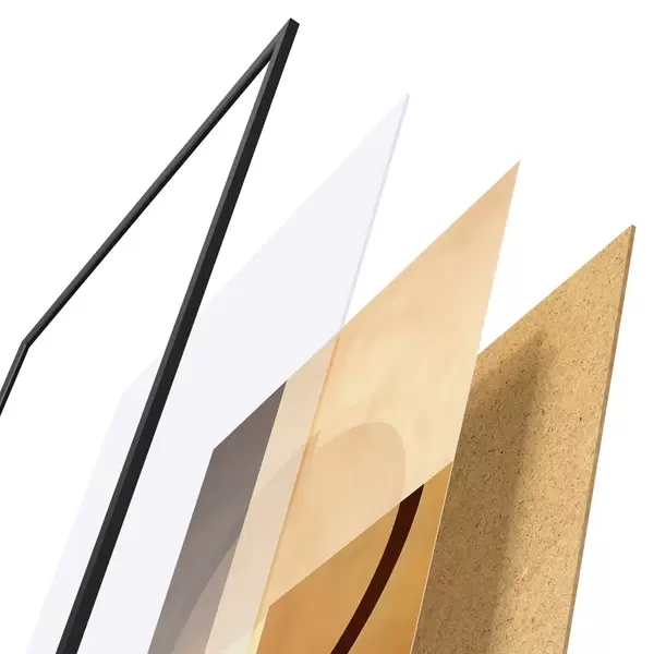 De poster bestaat uit een frame, plexiglas, geprinte afbeelding en spaanplaat achterkant. De poster kan meteen aan de muur worden gehangen dankzij de bevestigingen op de achterkant.