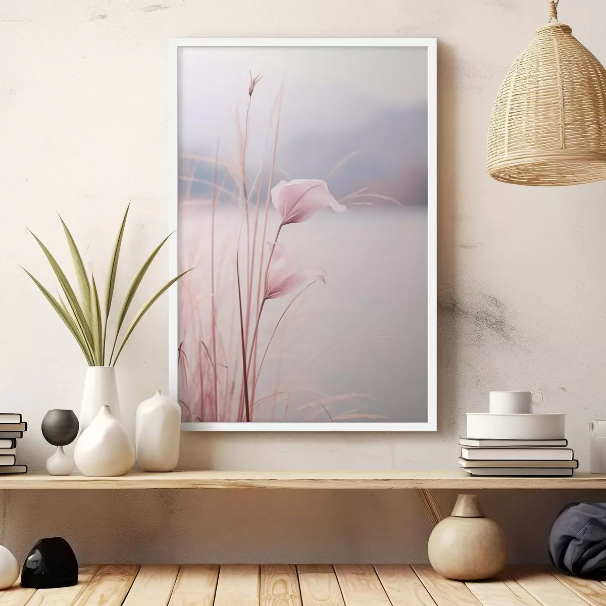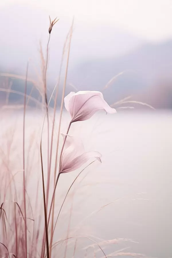 Poster Delicate roze bloesems aan een rustig meer Nr f46503