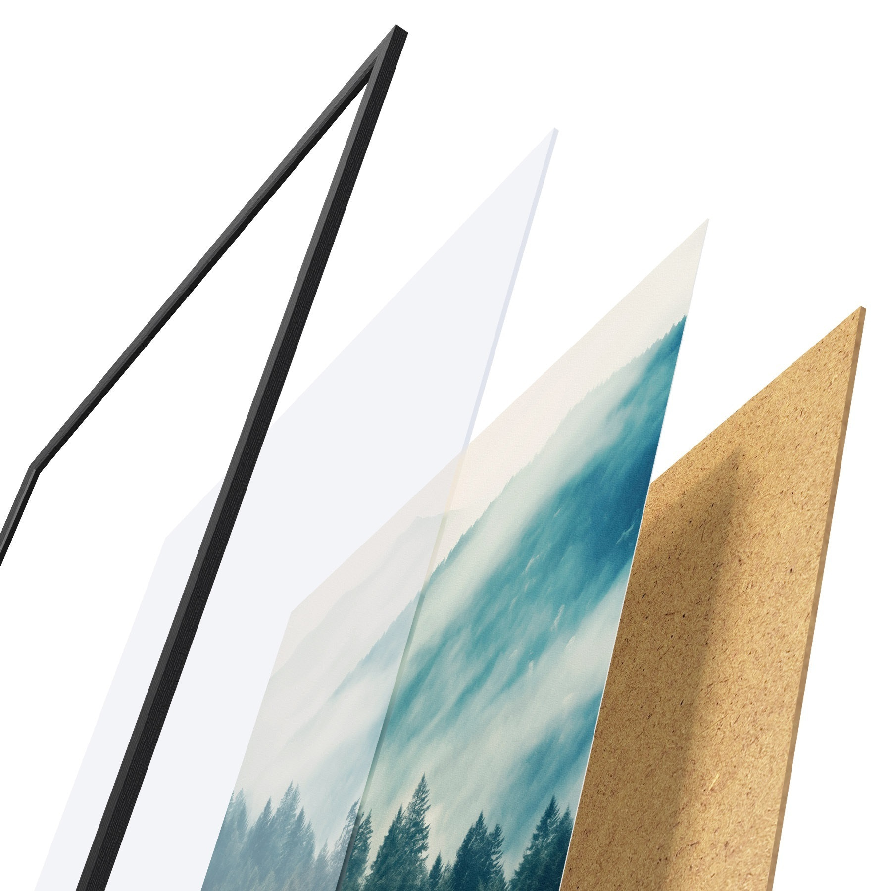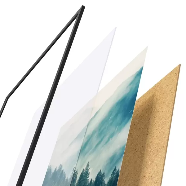 De poster bestaat uit een frame, plexiglas, geprinte afbeelding en spaanplaat achterkant. De poster kan meteen aan de muur worden gehangen dankzij de bevestigingen op de achterkant.