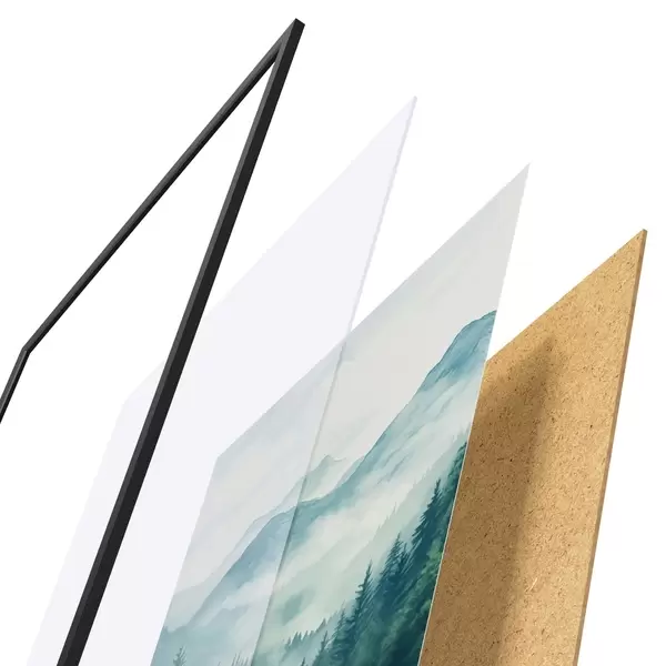 De poster bestaat uit een frame, plexiglas, geprinte afbeelding en spaanplaat achterkant. De poster kan meteen aan de muur worden gehangen dankzij de bevestigingen op de achterkant.