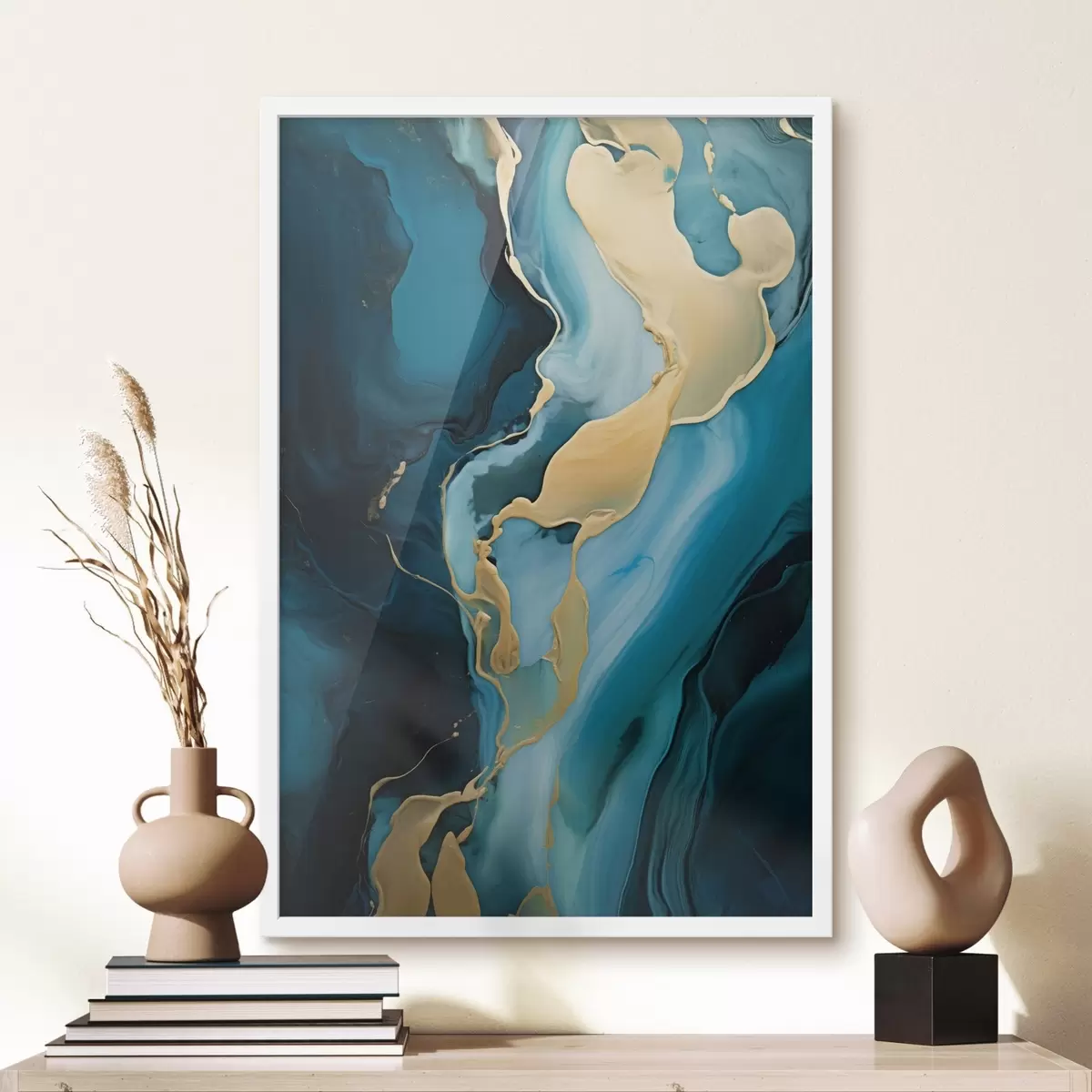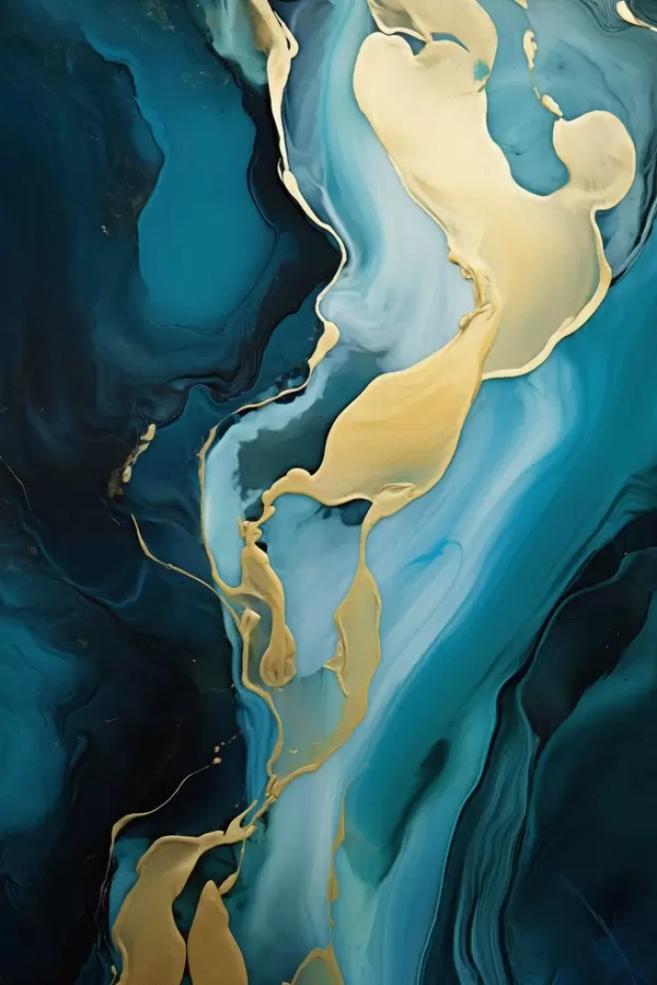 Poster Tealblauw abstract met een stroom oker Nr f46530