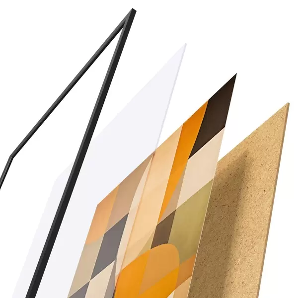 De poster bestaat uit een frame, plexiglas, geprinte afbeelding en spaanplaat achterkant. De poster kan meteen aan de muur worden gehangen dankzij de bevestigingen op de achterkant.