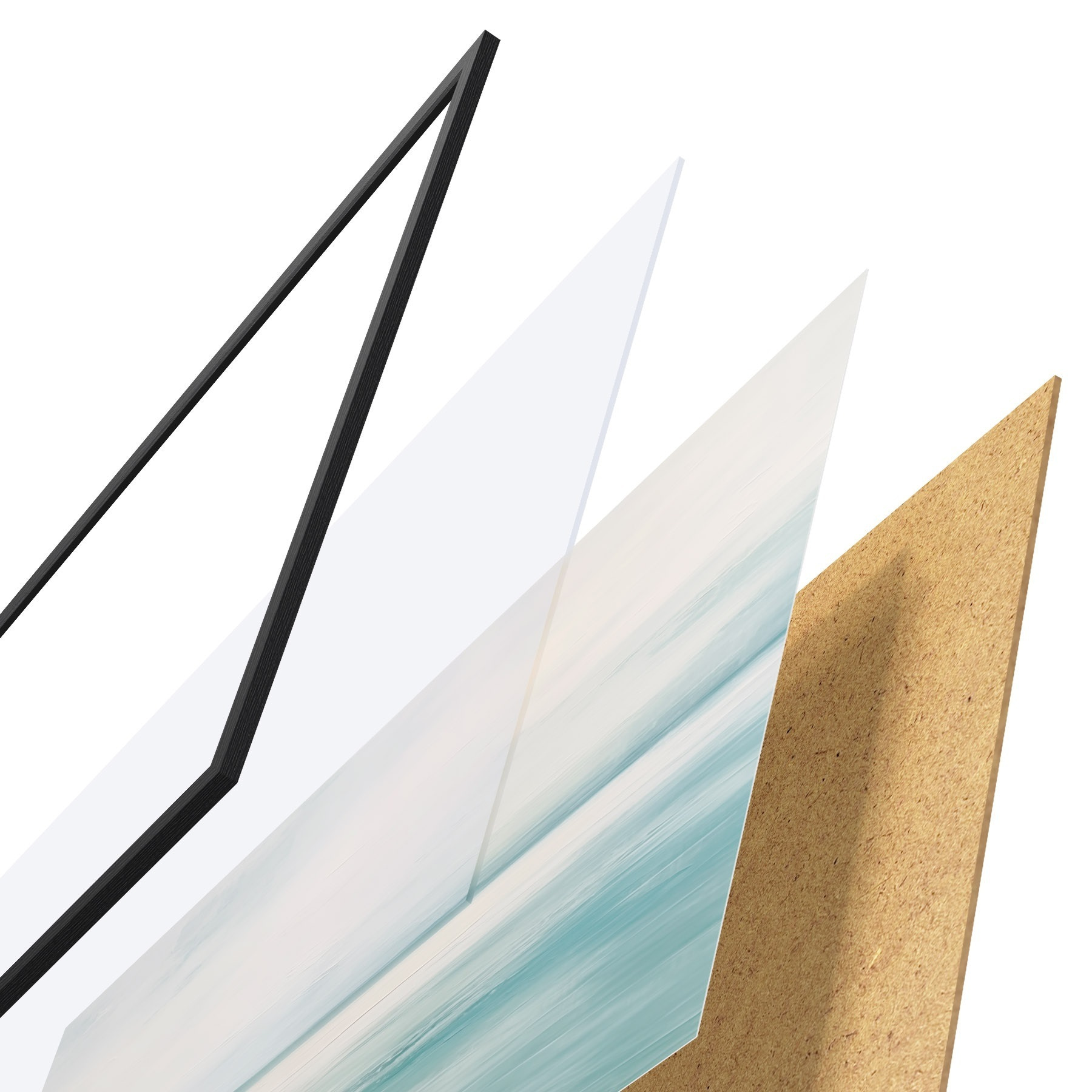 De poster bestaat uit een frame, plexiglas, geprinte afbeelding en spaanplaat achterkant. De poster kan meteen aan de muur worden gehangen dankzij de bevestigingen op de achterkant.