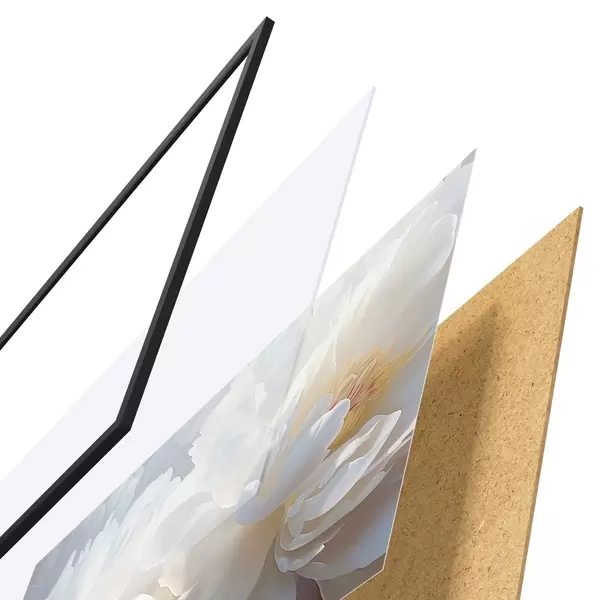 De poster bestaat uit een frame, plexiglas, geprinte afbeelding en spaanplaat achterkant. De poster kan meteen aan de muur worden gehangen dankzij de bevestigingen op de achterkant.