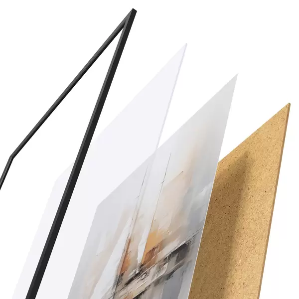 De poster bestaat uit een frame, plexiglas, geprinte afbeelding en spaanplaat achterkant. De poster kan meteen aan de muur worden gehangen dankzij de bevestigingen op de achterkant.