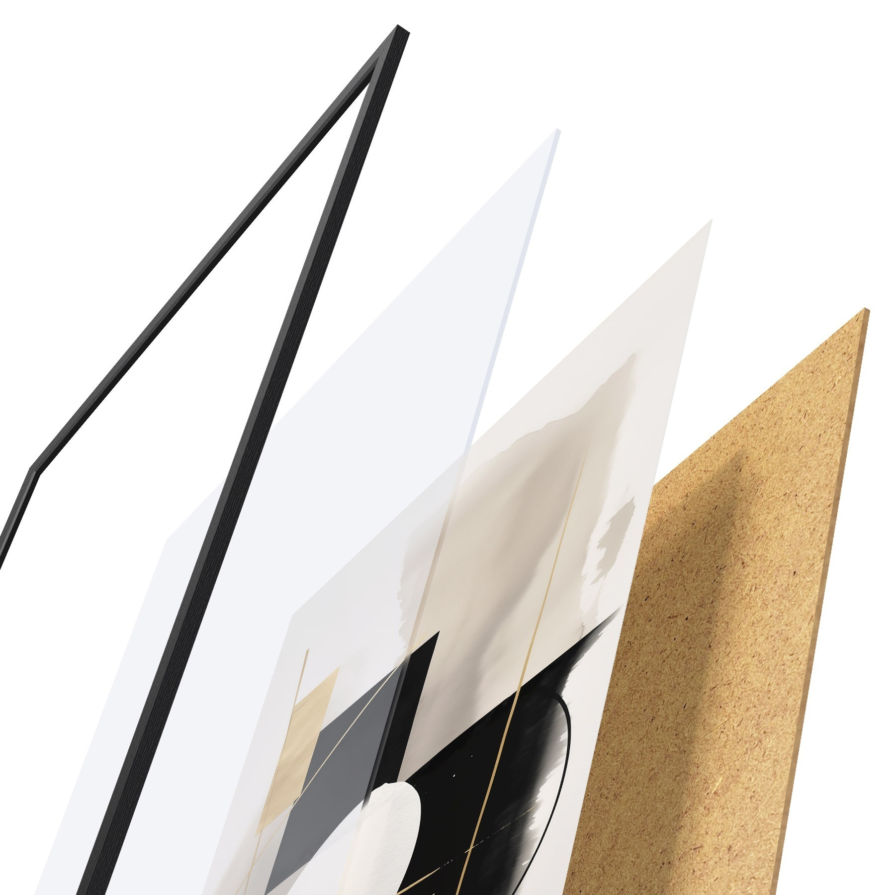 De poster bestaat uit een frame, plexiglas, geprinte afbeelding en spaanplaat achterkant. De poster kan meteen aan de muur worden gehangen dankzij de bevestigingen op de achterkant.