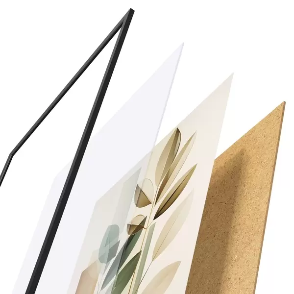 De poster bestaat uit een frame, plexiglas, geprinte afbeelding en spaanplaat achterkant. De poster kan meteen aan de muur worden gehangen dankzij de bevestigingen op de achterkant.
