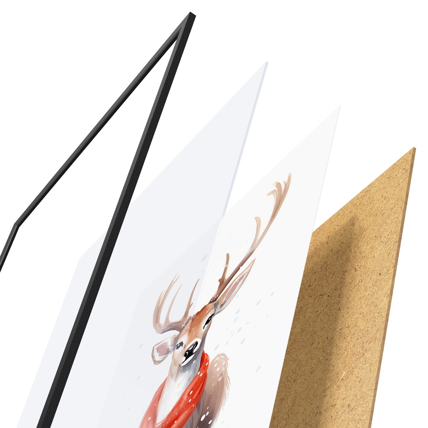 De poster bestaat uit een frame, plexiglas, geprinte afbeelding en spaanplaat achterkant. De poster kan meteen aan de muur worden gehangen dankzij de bevestigingen op de achterkant.