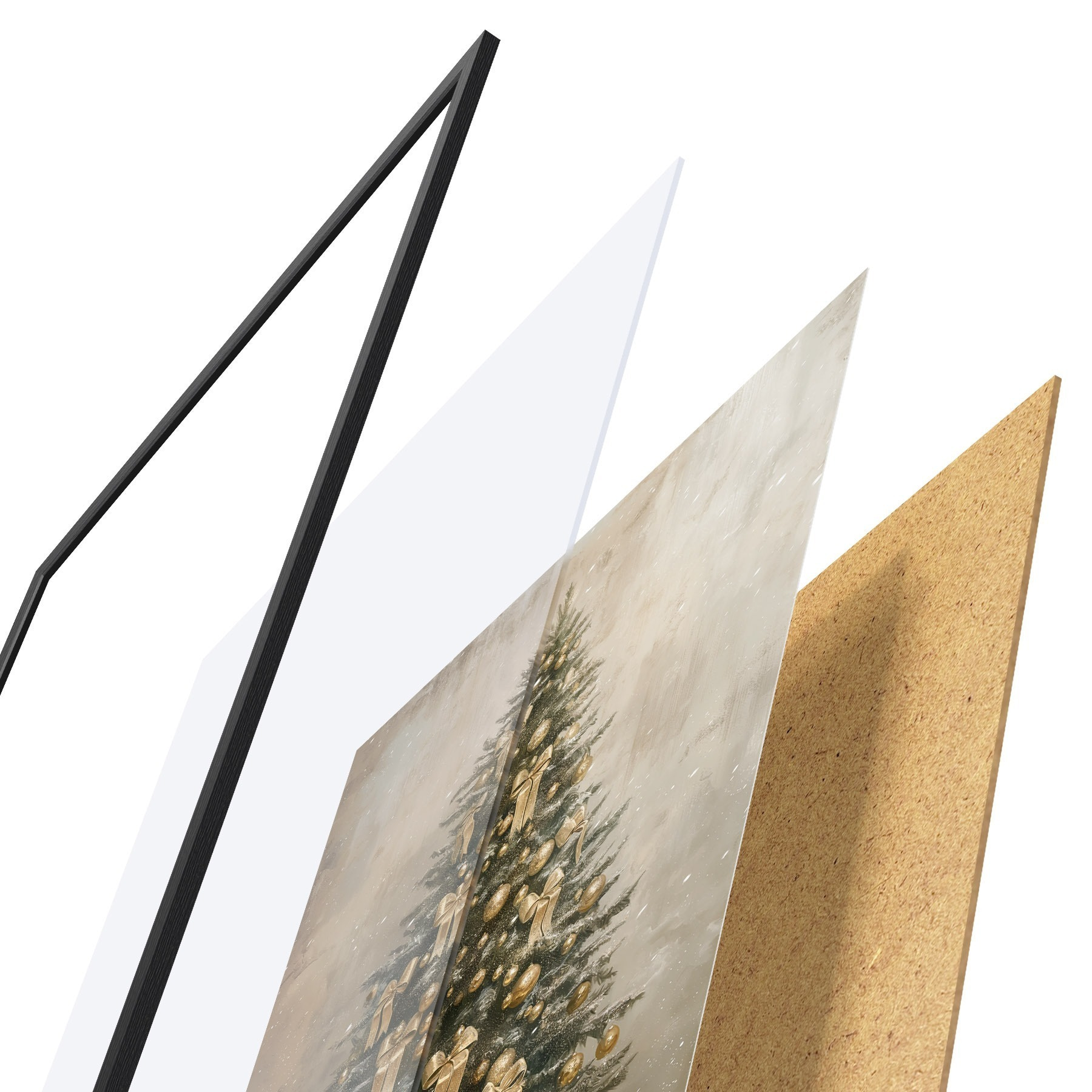 De poster bestaat uit een frame, plexiglas, geprinte afbeelding en spaanplaat achterkant. De poster kan meteen aan de muur worden gehangen dankzij de bevestigingen op de achterkant.