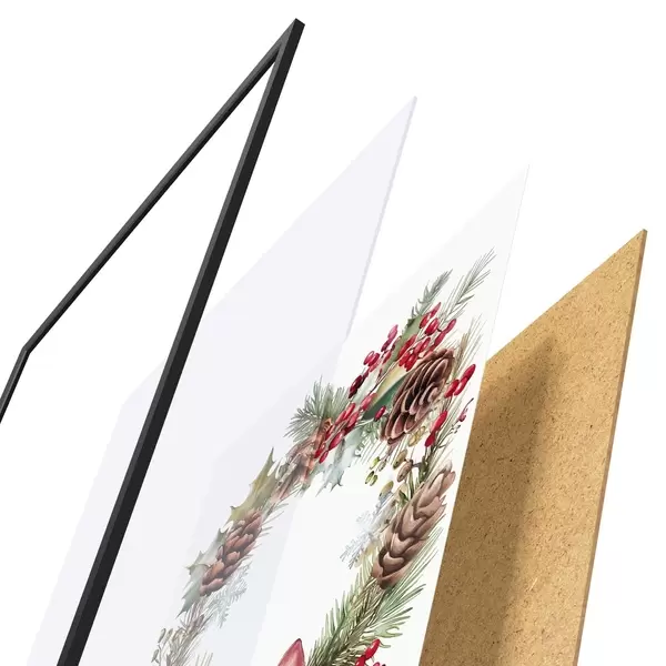 De poster bestaat uit een frame, plexiglas, geprinte afbeelding en spaanplaat achterkant. De poster kan meteen aan de muur worden gehangen dankzij de bevestigingen op de achterkant.