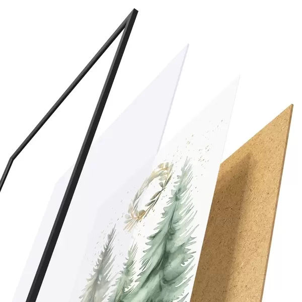 De poster bestaat uit een frame, plexiglas, geprinte afbeelding en spaanplaat achterkant. De poster kan meteen aan de muur worden gehangen dankzij de bevestigingen op de achterkant.