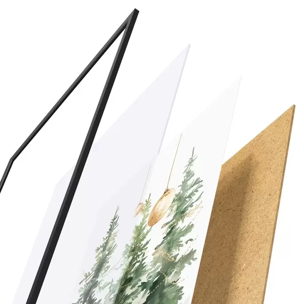 De poster bestaat uit een frame, plexiglas, geprinte afbeelding en spaanplaat achterkant. De poster kan meteen aan de muur worden gehangen dankzij de bevestigingen op de achterkant.