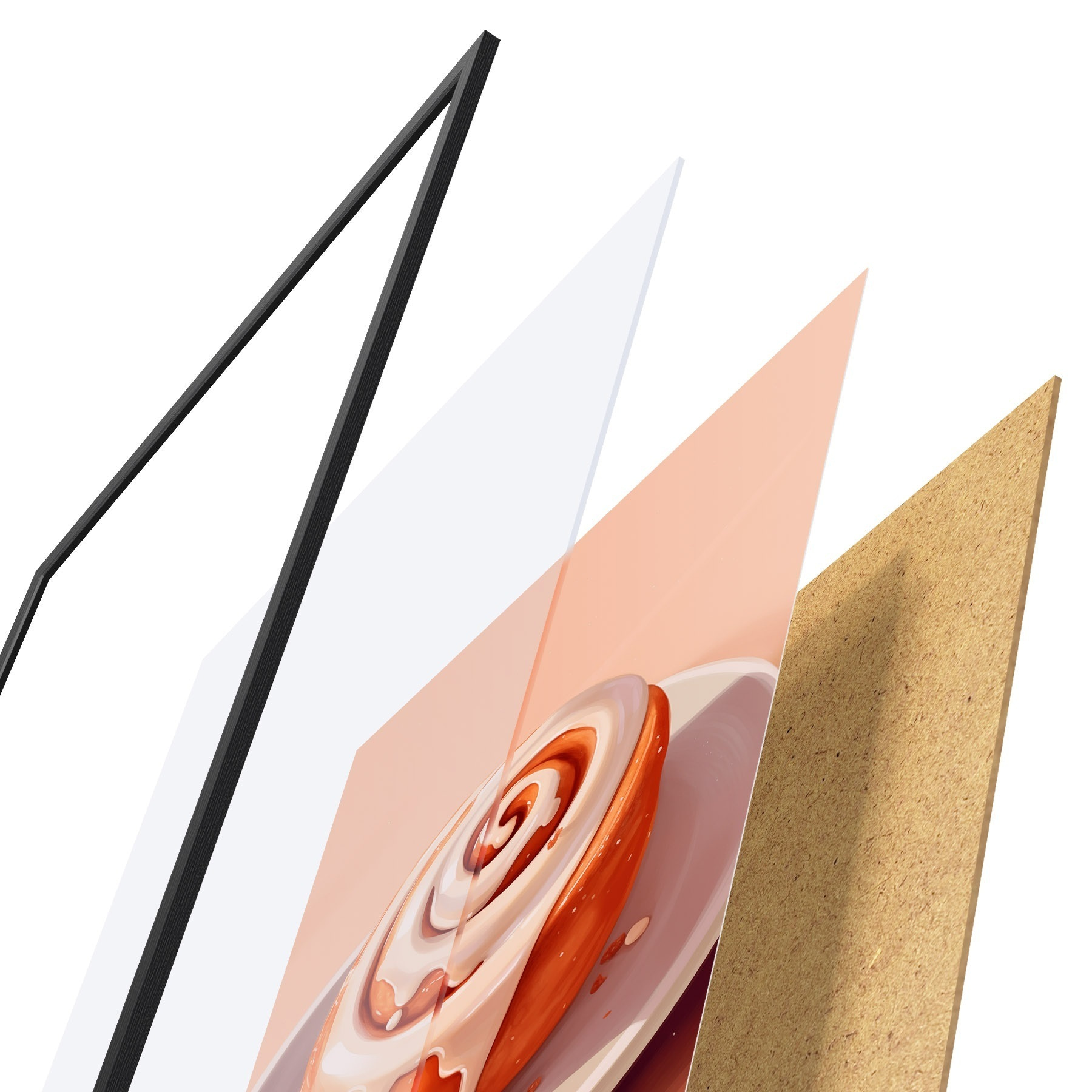 De poster bestaat uit een frame, plexiglas, geprinte afbeelding en spaanplaat achterkant. De poster kan meteen aan de muur worden gehangen dankzij de bevestigingen op de achterkant.