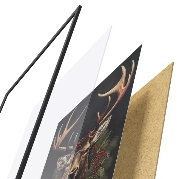 De poster bestaat uit een frame, plexiglas, geprinte afbeelding en spaanplaat achterkant. De poster kan meteen aan de muur worden gehangen dankzij de bevestigingen op de achterkant.