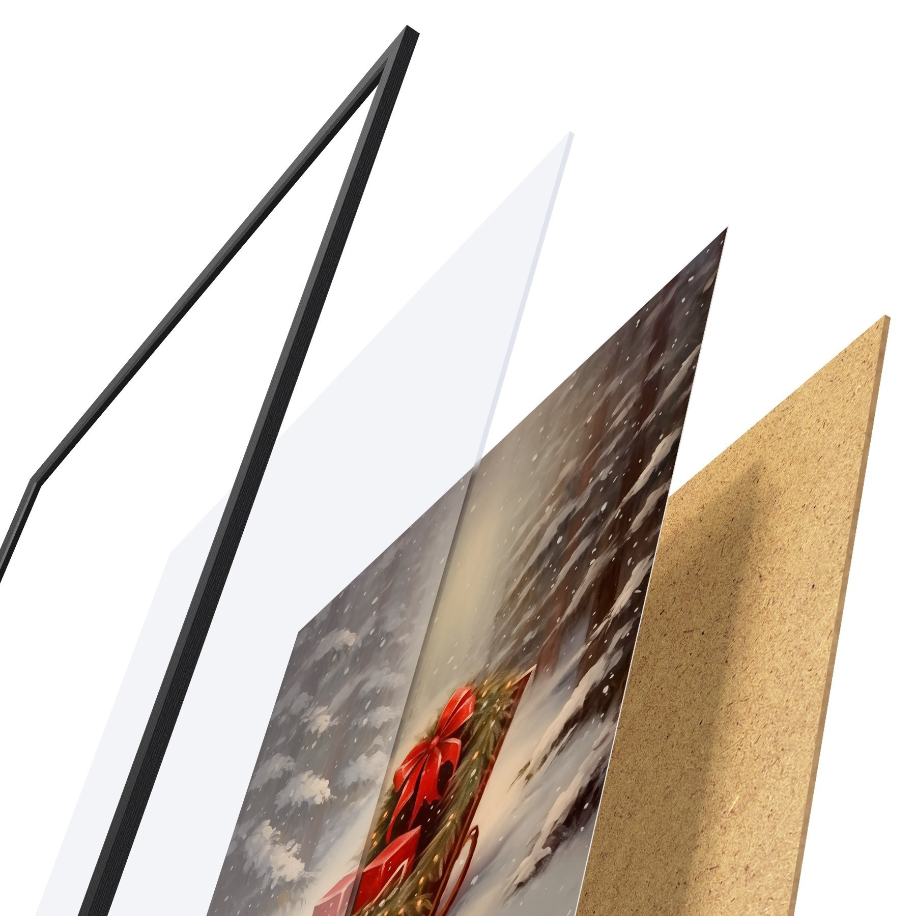 De poster bestaat uit een frame, plexiglas, geprinte afbeelding en spaanplaat achterkant. De poster kan meteen aan de muur worden gehangen dankzij de bevestigingen op de achterkant.