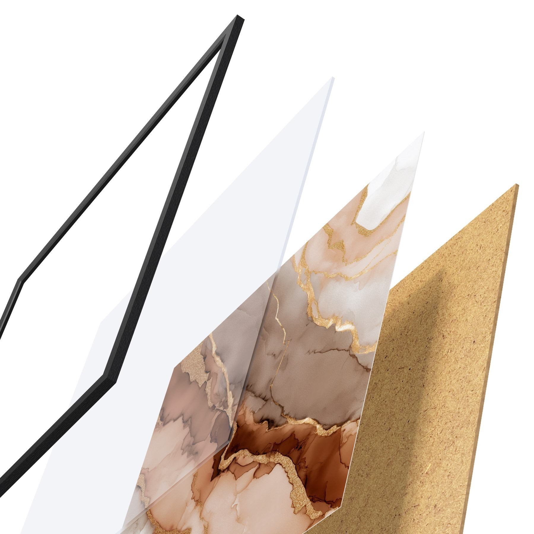 De poster bestaat uit een frame, plexiglas, geprinte afbeelding en spaanplaat achterkant. De poster kan meteen aan de muur worden gehangen dankzij de bevestigingen op de achterkant.