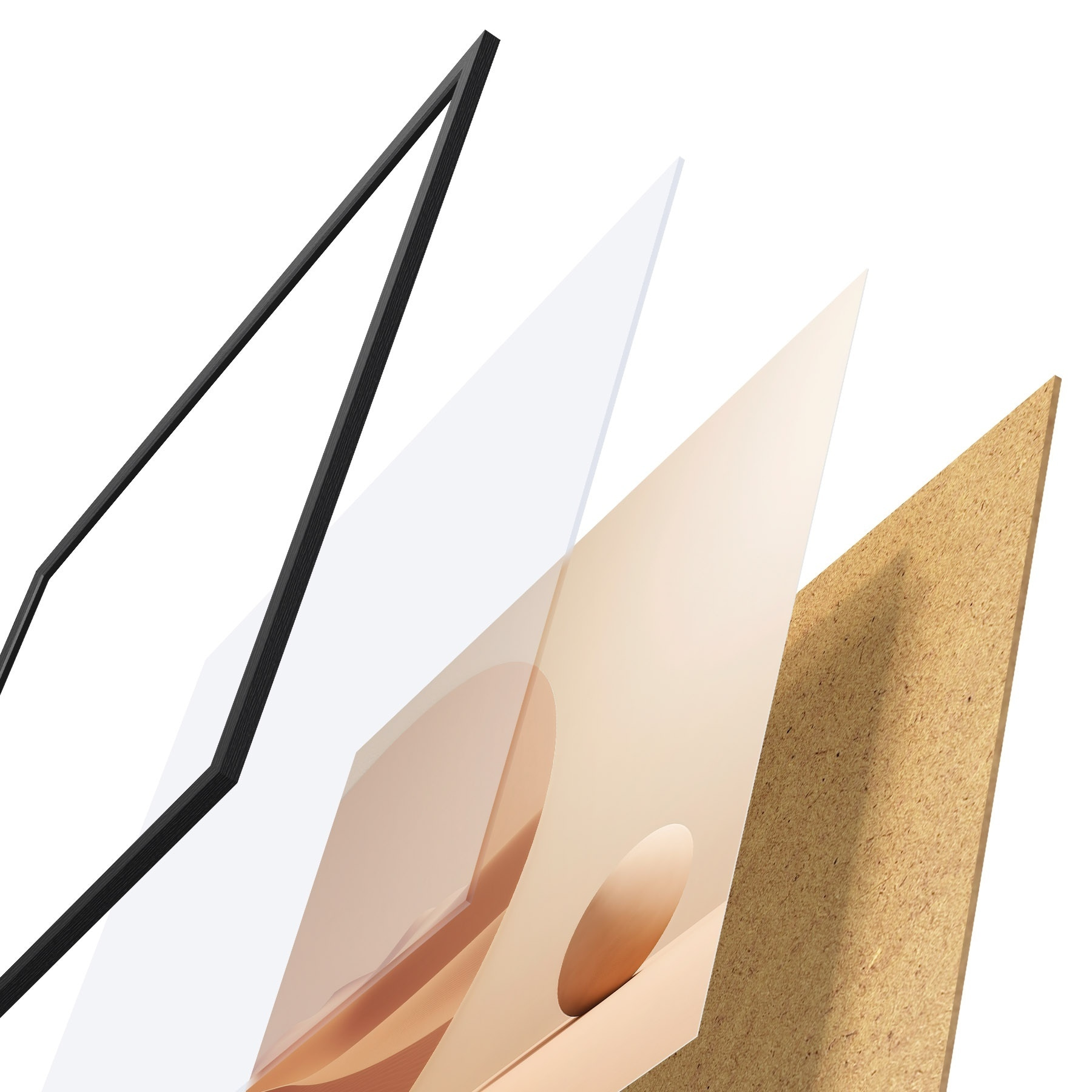 De poster bestaat uit een frame, plexiglas, geprinte afbeelding en spaanplaat achterkant. De poster kan meteen aan de muur worden gehangen dankzij de bevestigingen op de achterkant.