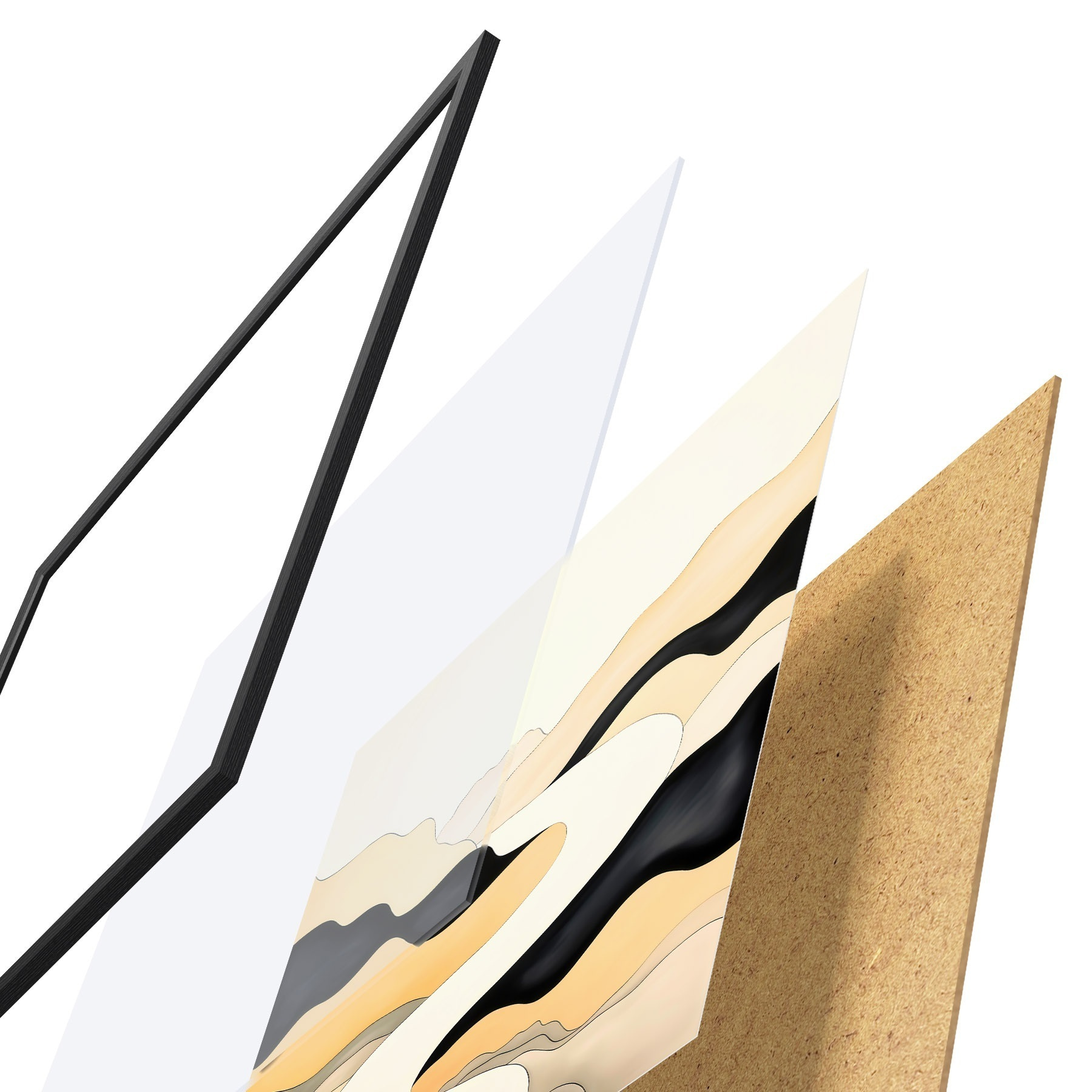 De poster bestaat uit een frame, plexiglas, geprinte afbeelding en spaanplaat achterkant. De poster kan meteen aan de muur worden gehangen dankzij de bevestigingen op de achterkant.