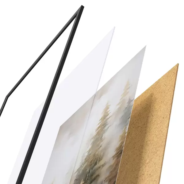 De poster bestaat uit een frame, plexiglas, geprinte afbeelding en spaanplaat achterkant. De poster kan meteen aan de muur worden gehangen dankzij de bevestigingen op de achterkant.