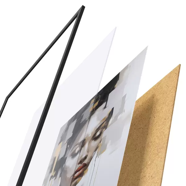 De poster bestaat uit een frame, plexiglas, geprinte afbeelding en spaanplaat achterkant. De poster kan meteen aan de muur worden gehangen dankzij de bevestigingen op de achterkant.
