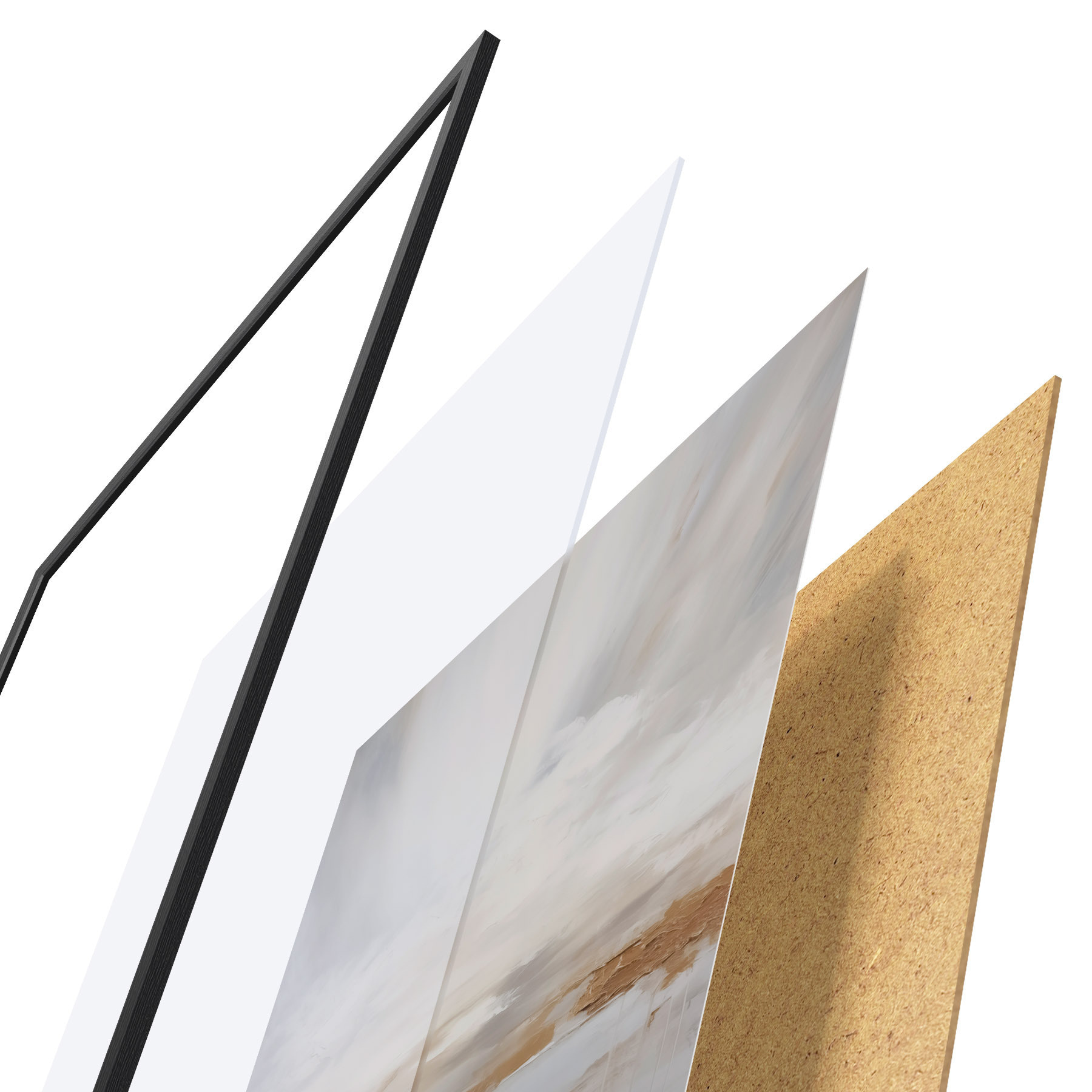 De poster bestaat uit een frame, plexiglas, geprinte afbeelding en spaanplaat achterkant. De poster kan meteen aan de muur worden gehangen dankzij de bevestigingen op de achterkant.
