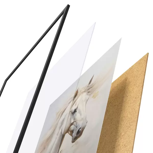De poster bestaat uit een frame, plexiglas, geprinte afbeelding en spaanplaat achterkant. De poster kan meteen aan de muur worden gehangen dankzij de bevestigingen op de achterkant.